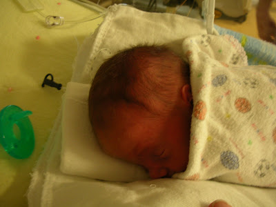 I have yet to make a decision as to what color his hair is.... Looks dark to me..but then they keep the NICU dim... towards his ears might be blondish... I don't know....